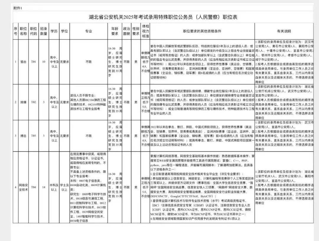 2025年湖北省公安机关计划招录特殊职位公务员(人民警察)30名,共设置狙击、排爆、搏击、网络安全技术等4个职位(详见附件1)。