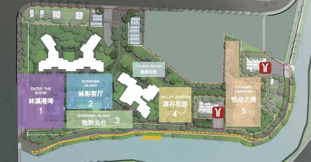 整个滨水园林包括了5大功能区,主入口的林溪港湾、拾阶云台、漂浮会客庭院、亲子儿童乐园(即溪谷花园)、配置羽毛球和篮球场的悦动之港,真正做到了一步即一景。