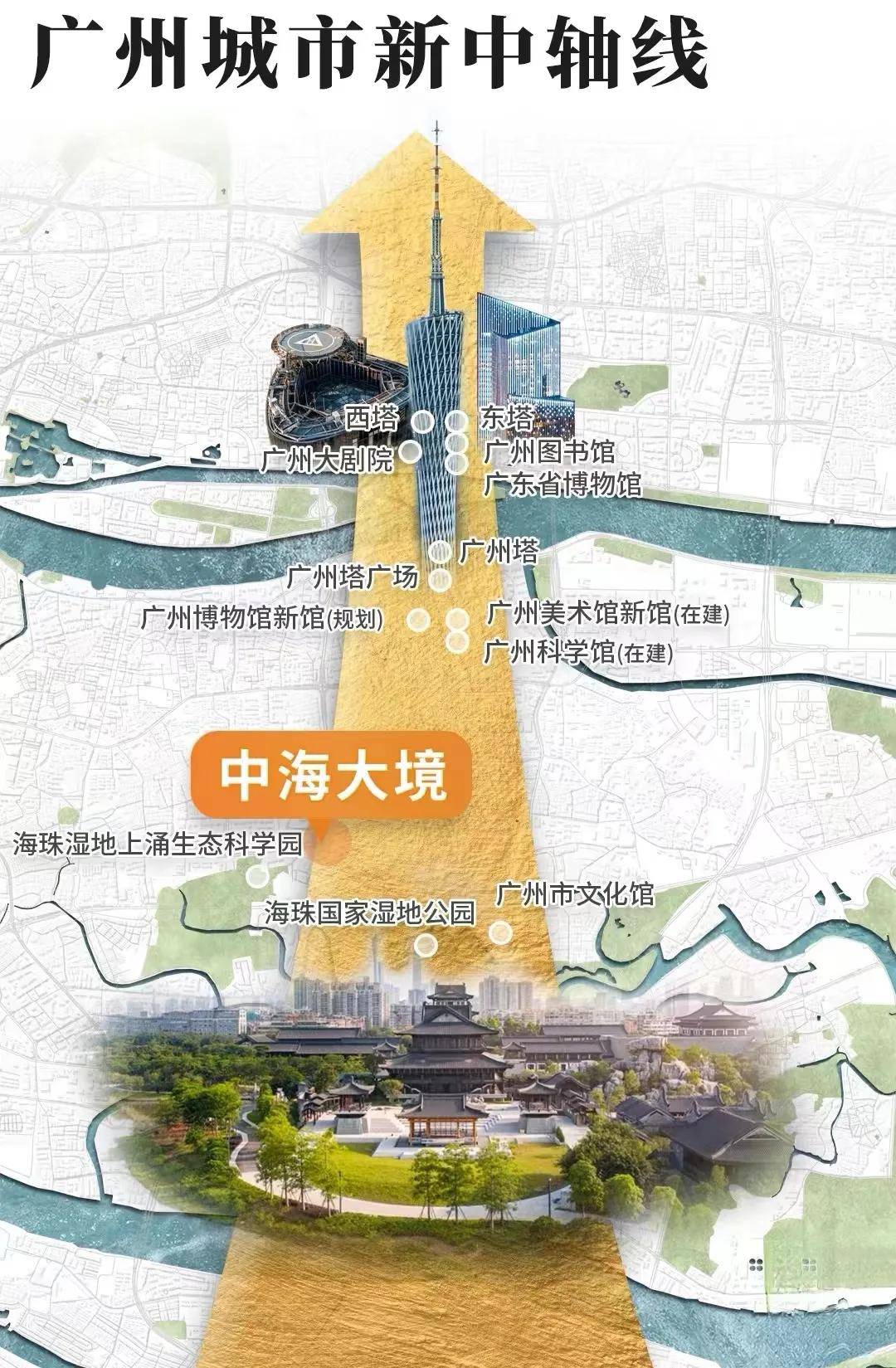 中海大境,就坐落在这条极具含金量的中轴线公里处,广州博物馆新馆、美术馆新馆、广州科学馆、广州文化馆新馆,还有对标天环广场的广州塔广场......