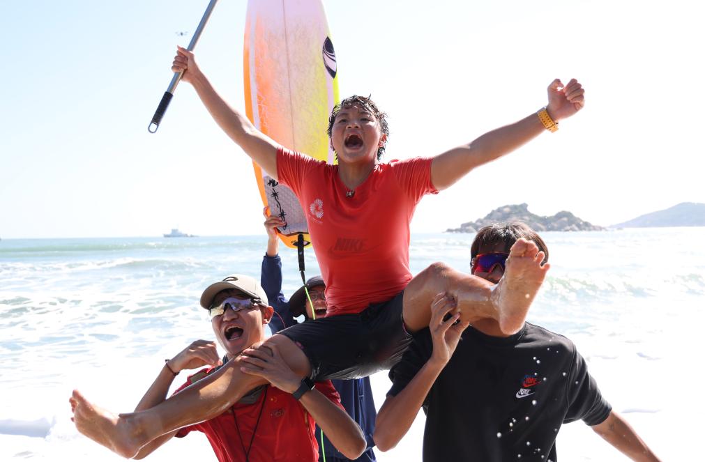11月11日,河北队选手于子迪(左)在女子200米个人混合泳决赛后与浙江队选手余依婷拥抱致意。