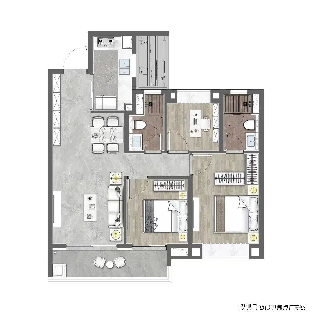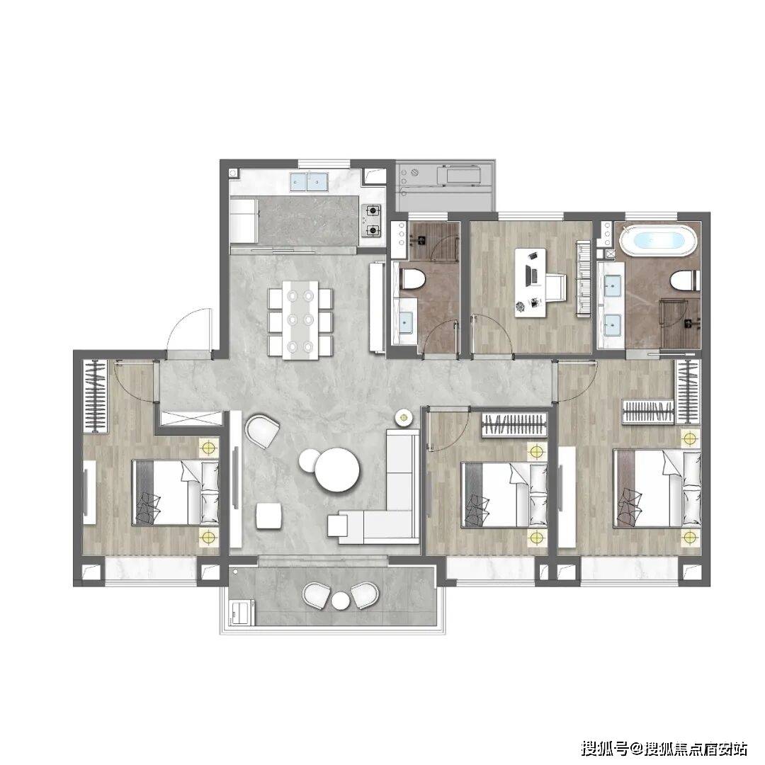 该户型做到了四开间朝南+南北通透+主卧套房设计+全卧室带飘窗,一步到位的大4房。