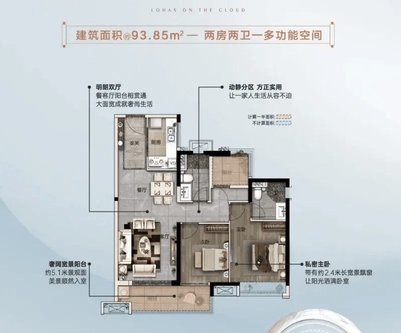 :7.2米景观阳台连接客厅和次卧,可放置跑步机+小型茶台,形成“健身+休闲”复合空间