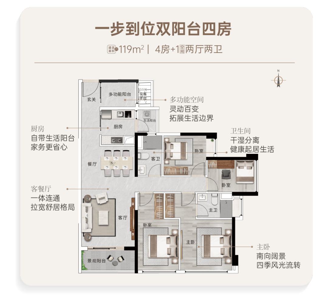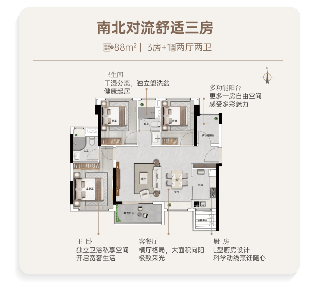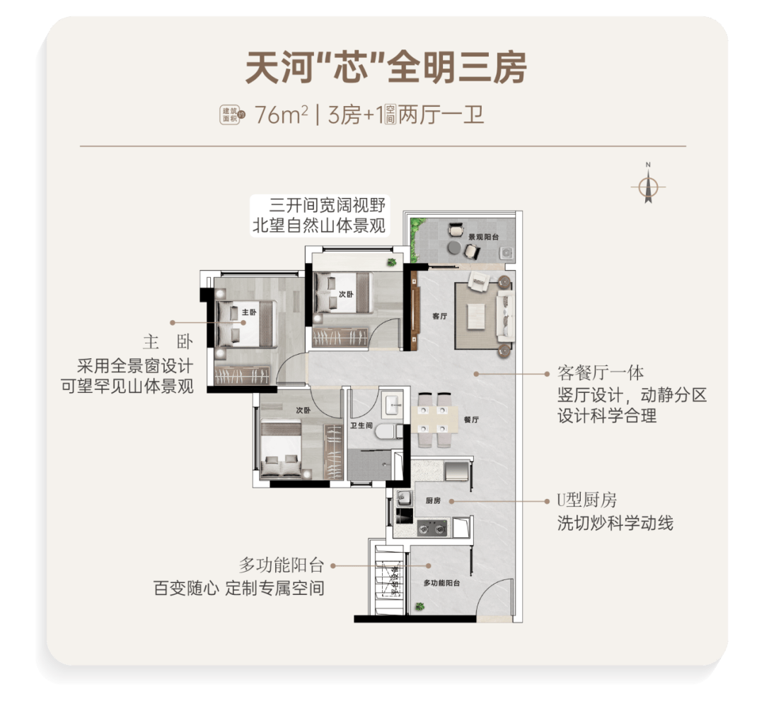 3开间布局,客餐空间一体化,配备约14㎡的奢阔主卧套间,+1创意空间,赋予房屋超高的适用性与成长性。