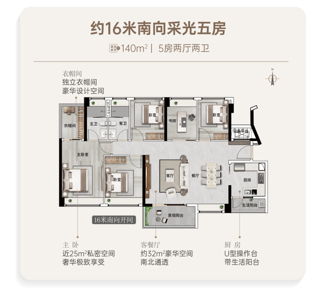 五房设计让多胎家庭每个孩子都有独立空间,约25㎡主卧套房让家长与孩子互不干扰。