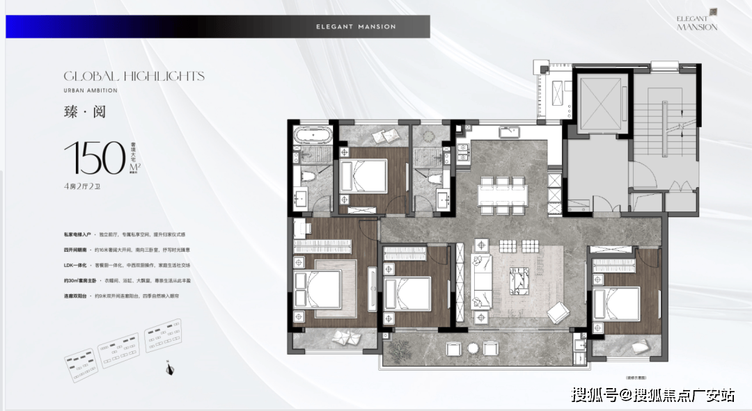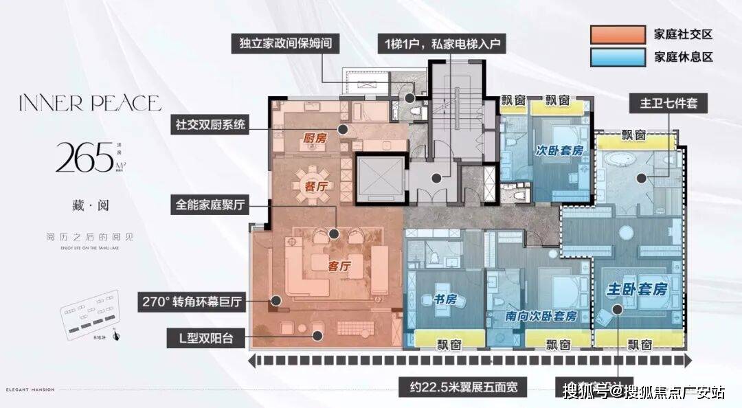 【户型亮点】私家电梯入户+独立入户玄关,私密性强。约5.6米的横厅+面宽约8.6观景阳台,采光、通风性能佳。双套房设计,让改善更彻底。